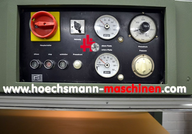 OTT Furnierpresse JU 2513, Baujahr 1983, elektro-hydraulisches System, neuwertige elektrische Alu-Heizplatten, auf Wunsch mit neuer Mylar-Schutzfolie (Aufpreis), 4 Zylinder, Sicherheitseinrichtungen, Reißleine, Pressfläche 2.550 x 1.300 mm, Zahnstange, neuwertiger Topzustand, funktionsgeprüft und vorführbereit ab Dez.2025