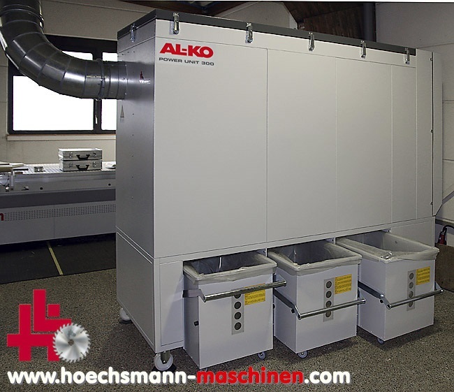 AL-KO PowerUnit APU300 P Silent Absaugung Mobilentstauber, in neuwertigem Zustand, CE Zeichen, Anlage schallgedämpft 71 dB, Motor 400 Volt - 7,5 kW, Ansaugstutzen Ø = 300 mm, Maschine pulverbeschichtet Vorabscheidung zur Filterschonung, 3 fahrbare Abscheidecontainer je 250 ltr. mit Staubschott, pneumatisch gesteuerte Filter-abreinigung (über SPS), Abmessungen: L= 3.000 mm, B= 1.058 mm, H= 2.361 mm, Gewicht 838 kg, max. Volumenstrom 6.000 m³/h, max. Unterdruck 2.587 Pa,