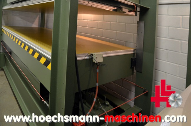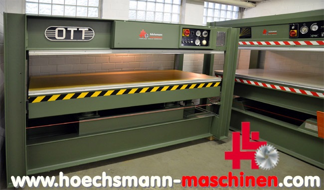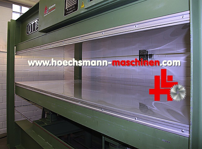 OTT Furnierpresse JU 2513, Baujahr 1983, elektro-hydraulisches System, neuwertige elektrische Alu-Heizplatten, auf Wunsch mit neuer Mylar-Schutzfolie (Aufpreis), 4 Zylinder, Sicherheitseinrichtungen, Reißleine, Pressfläche 2.550 x 1.300 mm, Zahnstange, neuwertiger Topzustand, funktionsgeprüft und vorführbereit ab Dez.2025