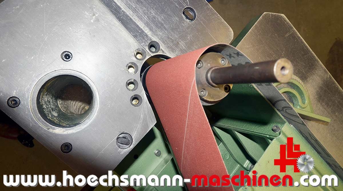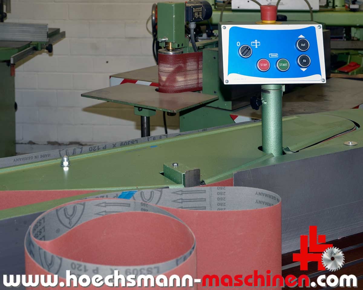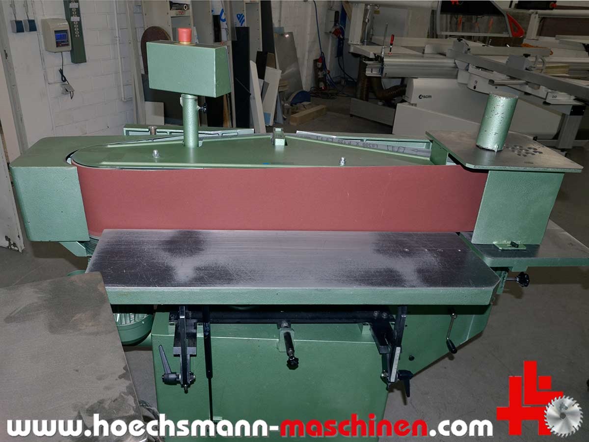Enorm Kantenschleifmaschine LBK-D, Baujahr 1995, neigbar und höhenverstellbar, Tischbreite 280 mm, Tischlänge 1.000 mm, max. 200 mm Schleifbandbreite, Schleifband, Rundschleifauflage, Fahrwerk
